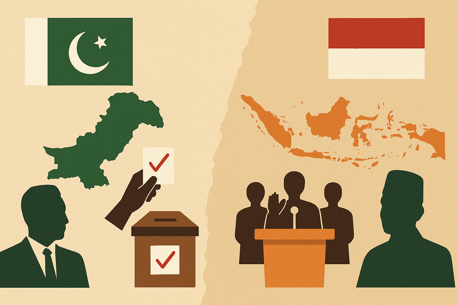 Evolusi sistem pemilu Pakistan dan Indonesia menunjukkan jalur yang menarik dan berbeda dalam perjalanan demokrasi dua negara Muslim terbesar di dunia. Pakistan dan Indonesia lahir dari semangat perjuangan kemerdekaan, namun menempuh jalur politik yang tidak sama dalam membangun sistem pemilu dan pemerintahannya. Artikel ini membahas perkembangan sistem pemilu, perbedaan utama sistem pemerintahan, tantangan yang dihadapi, serta peluang masa depan demokrasi di kedua negara.